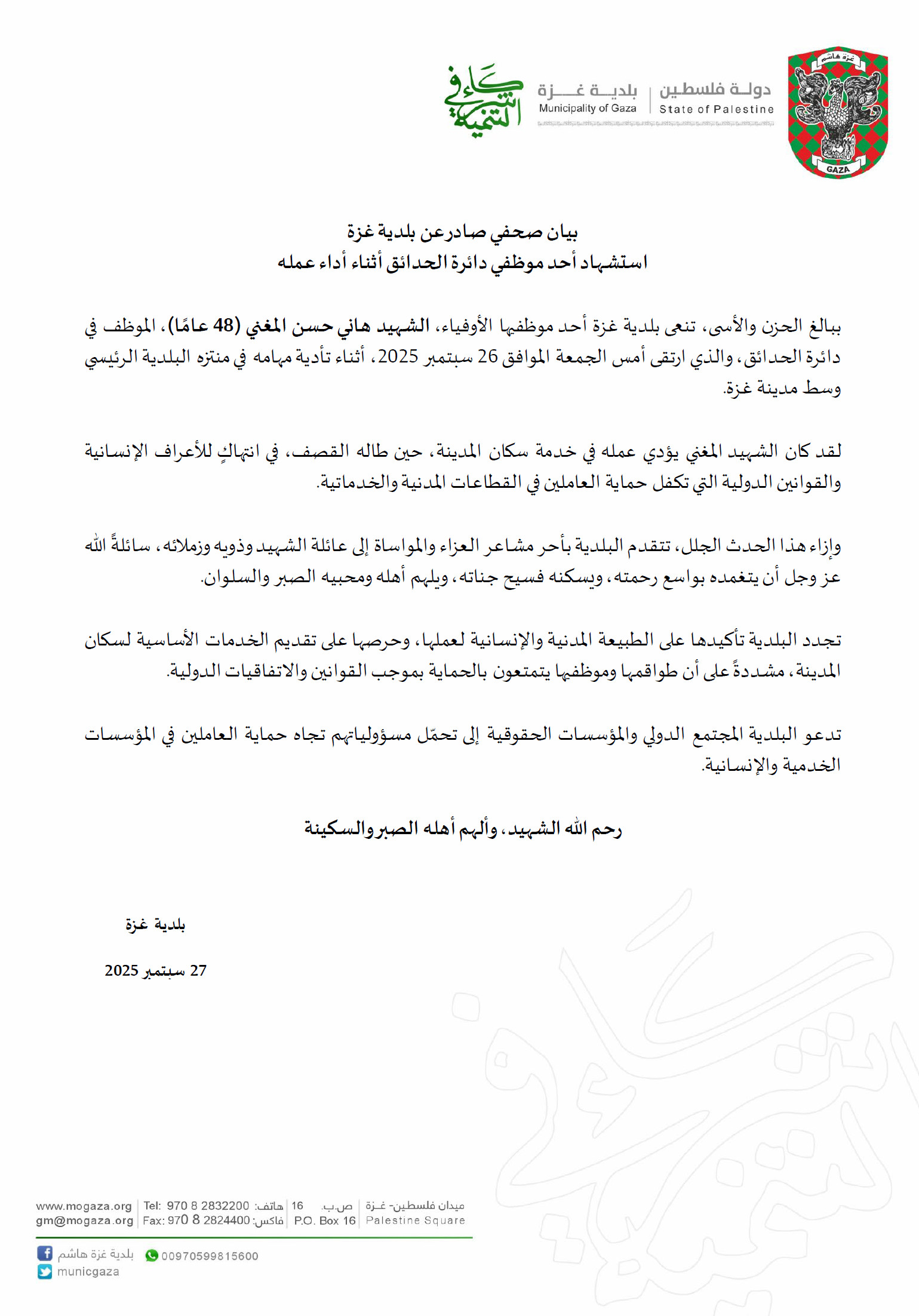 ببالغ الحزن والأسى، تنعى بلدية غزة أحد موظفيها الأوفياء، الشهيد هاني حسن المغني (48 عامًا)، الموظف في دائرة الحدائق، والذي ارتقى أمس الجمعة الموافق 26 سبتمبر 2025، أثناء تأدية مهامه في منتزه البلدية الرئيسي وسط مدينة غزة.