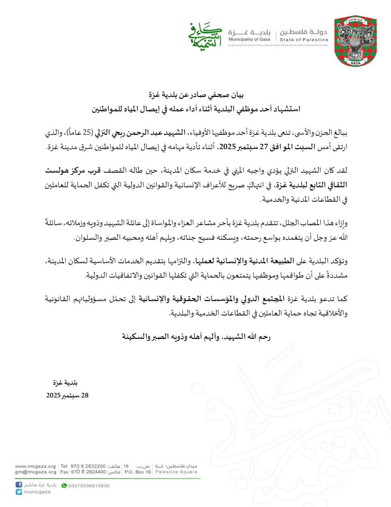 ببالغ الحزن والأسى، تنعى بلدية غزة أحد موظفيها الأوفياء، الشهيد عبد الرحمن ربحي النزلي (25 عاماً)، والذي ارتقى أمس السبت الموافق 27 سبتمبر 2025، أثناء تأدية مهامه في إيصال المياه للمواطنين شرق مدينة غزة.